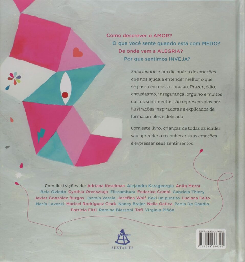 Emocionário é um dicionário de emoções que nos ajuda a entender melhor o que se passa em nosso coração. Prazer, ódio, entusiasmo, insegurança, orgulho e muitos outros sentimentos são representados por ilustrações inspiradoras e explicados de forma simples e delicada.